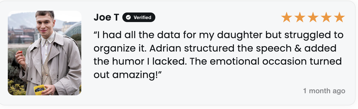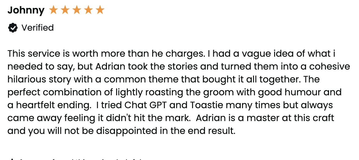 Most AI tools learn from random internet content. This one? It's trained using thousands of Adrian’s real best man speeches – ones that got big laughs, applause, and standing ovations.Unlike ChatGPT and other tools that pull from whatever they find online, this AI knows exactly what makes wedding guests chuckle, what stories work, and how to hit those emotional notes perfectly. Because it's learnt from speeches that brought the house down.